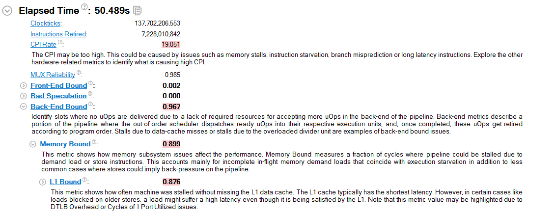 从这里也能看出来,MKL 的随机数生成器其实是高度优化过的了,速度非常快,并不输简单 RNG 太多。而下面的计算,瓶颈主要是那些圆内圆外的判断上,VTune 给出的报告中,pipeline stall 的原因里,bad speculation 占了很大一部分,而这显然也是我们无法改善的——毕竟都是随机数。