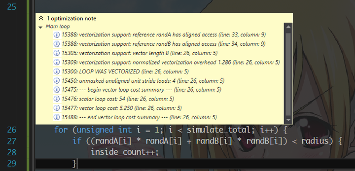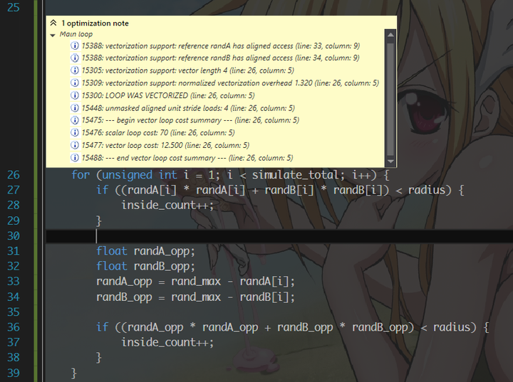 接着,我们看到了大循环。有循环当然要考虑做 vectorization,充分利用 Intel 的新指令集。然而,你们真的拿衣服地以为要手动写 intrinsic 么?打开编译器的优化报告,