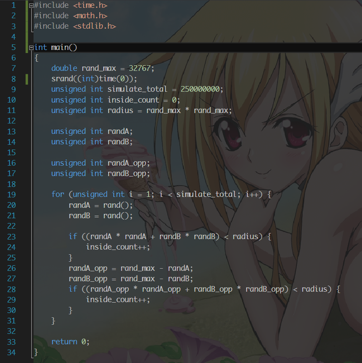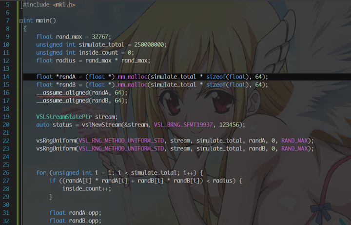 其实到这里已经很快了,MKL 的随机数生成器是一个比较安全的高质量生成器。但是如果想要更快的话,我们可以选择不是那么随机的,比如@Milo Yip 提供的,简单随机数生成器。不过好孩子们可不要学习哟,尤其是,Milo 叔叔向量化的代码有好几个 seed 哟,是好几个 rng 同时在生成哟,而 seed 选取不当的话,伪随机数的分布可就不再是 uniform 了哒哟,结果就不会再那么正确了哟。事实上,Milo 叔叔提供的代码,运行出来的结果是 3.14082. 这还只是 128 位的 SSE 指令集,而如果加宽 vector 的话,random distribution 误差还会更大,从而加大结果的误差。不过目前这个精度来看,一般应用的要求还是可以满足的。
