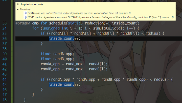 好了,让我们回到 vectorization 问题去。以往遇到 dependence 问题的时候,我们都会人工分析确认是不是有这些 dependence,如果没有的话则标记 #pragma ivdep 指示编译器这里没有 dependence. 但是现在有个问题是,这里我们用了 OpenMP reduction,这个东西在出现 dependence 时,有时候坑会很大。所以为了方便起见,我移除了 reduction,同时把 inside_count 拆成了上下两份。这还没完,我们一共有 16 个线程,那我把两个 inside_count 分别做成 16 元素的数组,让各个线程一个萝卜一个坑地往里面填,最后在外面另用一个 loop 求和,并不会增加多少 overhead.
