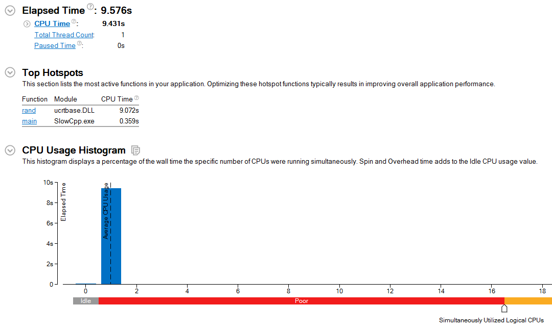 这段代码中,首先让我们移除 clock() 函数,改用 Intel VTune Amplifier 的计时,同时将循环扩大 100 倍让时间差异更明显,也方便 VTune 收集更多事件。