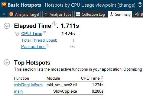 我试了下 Milo 叔叔的 RNG,向量化以后大概能达到 0.25s 的速度,相比较于 1.19s 来说提升还是挺大的。顺道改了一下 seed,准确度有些提升。而且,这是我们扩大 100 倍 simulate_total 的计时,要注意我们的运行时间只能和其它的 VTune 计时一起参考——因为 VTune 计数的是整个程序的运行时间——包括程序启动退出等,同时, VTune 对程序的运行速度也有影响。